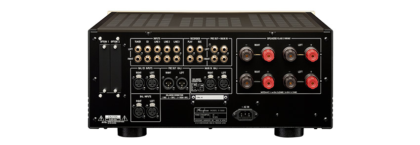 Wzmacniacz umożliwia podłączenie pięciu źródeł liniowych i dwóch zbalansowanych, z możliwością osobnego ustawienia fazy zarówno dla każdego z nich jak i pętli nagrywania, wyciszenia o 20 dB oraz przełączenia układu w tryb mono. Jeśli mimo wszystko istnieje konieczność korekty brzmienia nagrań, użytkowni ma do dyspozycji wysokiej klasy układ Loudness oraz aktywne filtry sumujące tonów wysokich i niskich. Podwójne zaciski głośnikowe są zabezpieczone niskoimpedancyjnymi przekaźnikami logicznymi MOS-FET i umożliwiają prawdziwy bi-amping. Oprócz tego E-5000 można wykorzystać jako topową końcówkę mocy, korzystając z osobnego wejścia liniowego lub symetrycznego. Na deser producent proponuje doskonałą sekcję słuchawkową zbudowaną z dyskretnych komponentów, umożliwia także rozbudowę o dwa dodatkowe, moduły takie pre-amp gramofonowy lub DAC.