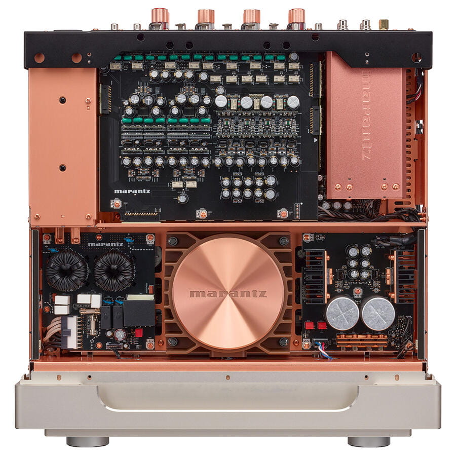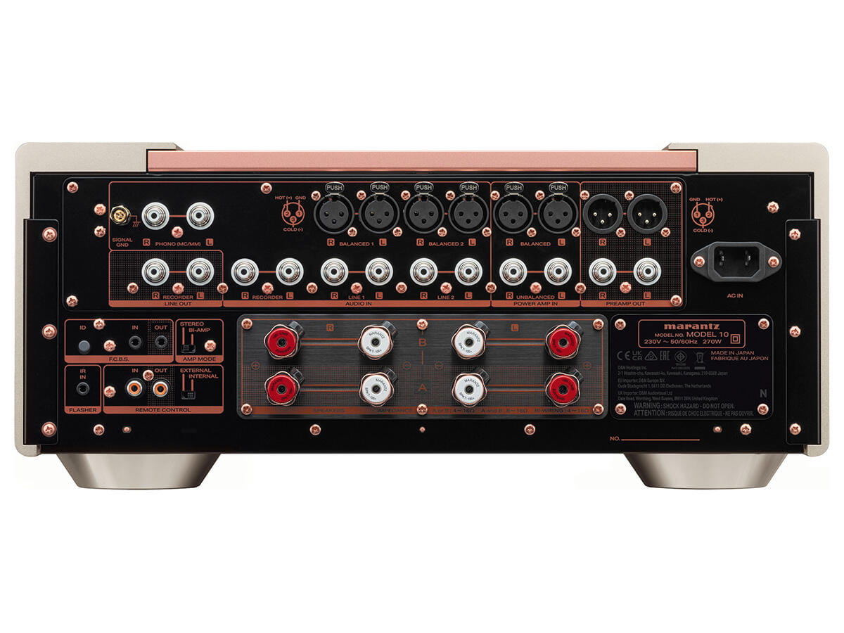 Kultowe detale stworzone na nowo dla jutra: zaprojektowany z przodu ze szczotkowanego aluminium, MODEL 10 jest zamknięty w miedziowanej, trójwarstwowej obudowie z podświetlaną siatką maskującą. Oświetlenie wewnątrz wzmacniacza eksponuje płytki drukowane, wysokiej jakości komponenty i specjalnie zaprojektowaną obudowę transformatora. W ukłonie w stronę DNA projektowego Marantz, iluminator MODEL 10 zawiera kolorowy wyświetlacz HD TFT do wyboru głośności i wejść, wraz z cyfrowym miernikiem poziomu, który zachowuje się jak klasyczne mierniki analogowe.