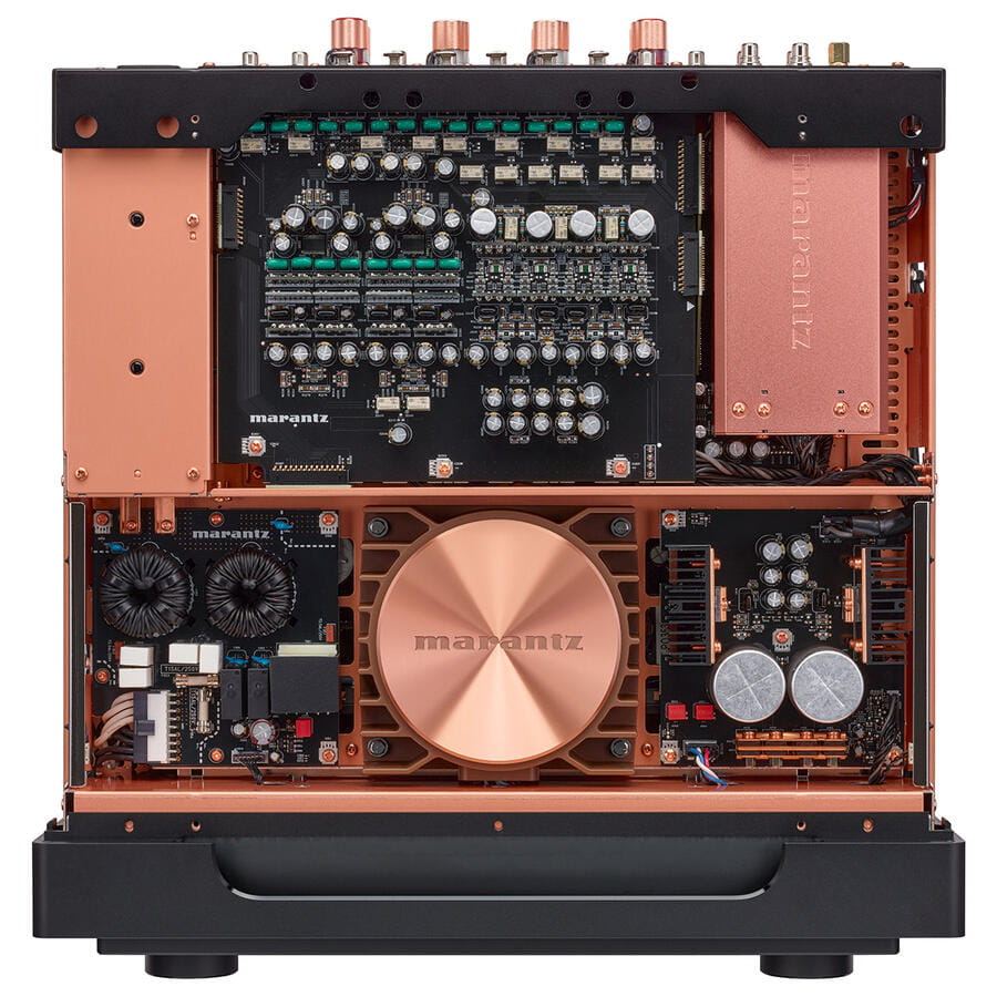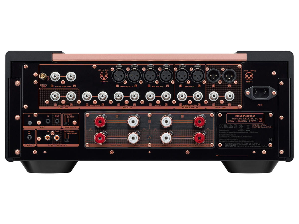 Kultowe detale stworzone na nowo dla jutra: zaprojektowany z przodu ze szczotkowanego aluminium, MODEL 10 jest zamknięty w miedziowanej, trójwarstwowej obudowie z podświetlaną siatką maskującą. Oświetlenie wewnątrz wzmacniacza eksponuje płytki drukowane, wysokiej jakości komponenty i specjalnie zaprojektowaną obudowę transformatora. W ukłonie w stronę DNA projektowego Marantz, iluminator MODEL 10 zawiera kolorowy wyświetlacz HD TFT do wyboru głośności i wejść, wraz z cyfrowym miernikiem poziomu, który zachowuje się jak klasyczne mierniki analogowe.