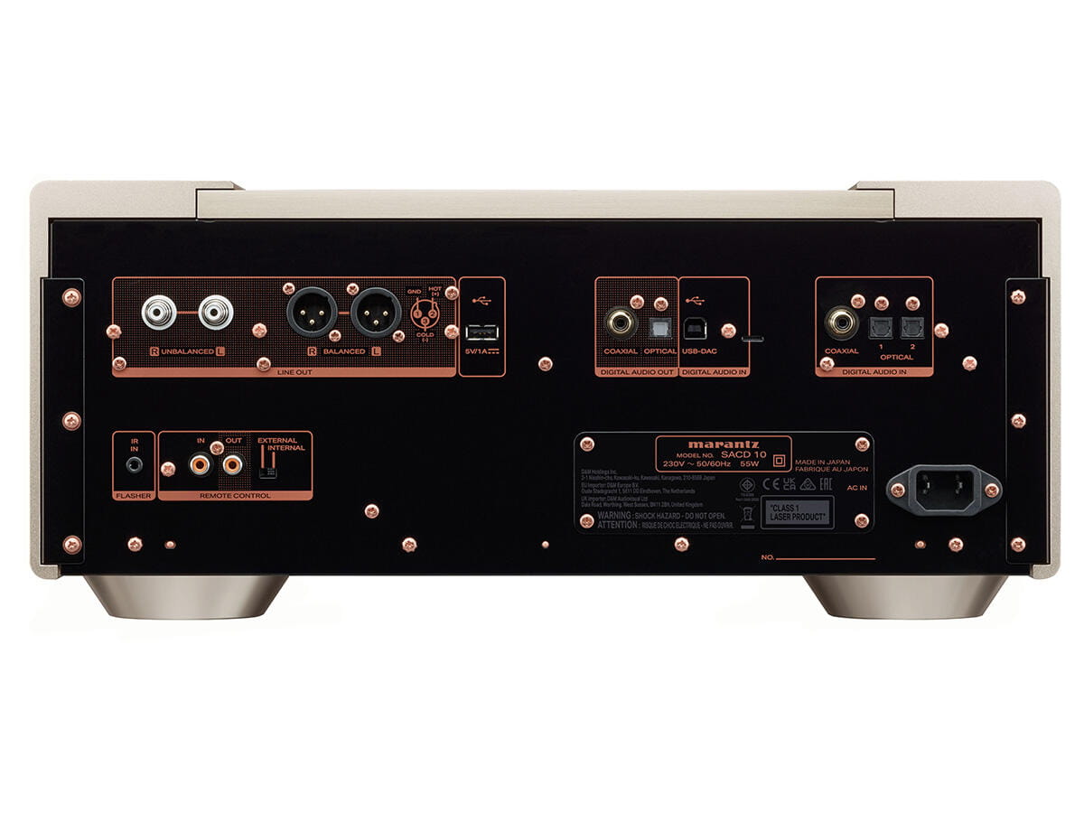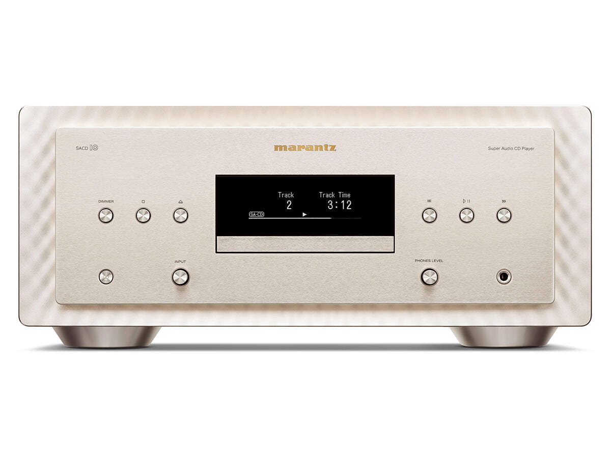 Wzornictwo przemysłowe Marantz: dzięki powierzchni sterującej ze szczotkowanego aluminium, detalom wykończeniowym, aluminiowej konstrukcji o grubym przekroju, miedziowanej, trójwarstwowej obudowie, SACD 10 jest klasą samą w sobie. Dostępny w dwóch wersjach kolorystycznych, Marantz Black i Marantz Champagne, aby uzupełnić każde otoczenie.