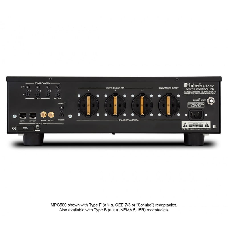 MPC500 zawiera 4 złącza typu F1 (np. CEE 7/3 lub „Schuko”); w każdym kraju dostępna jest tylko odpowiednia wersja, aby zapewnić zgodność z lokalnymi systemami zasilania. Kontrolę każdego gniazda można skonfigurować według własnych preferencji za pomocą portów Power Control na panelu tylnym lub za pomocą menu konfiguracji na panelu przednim.