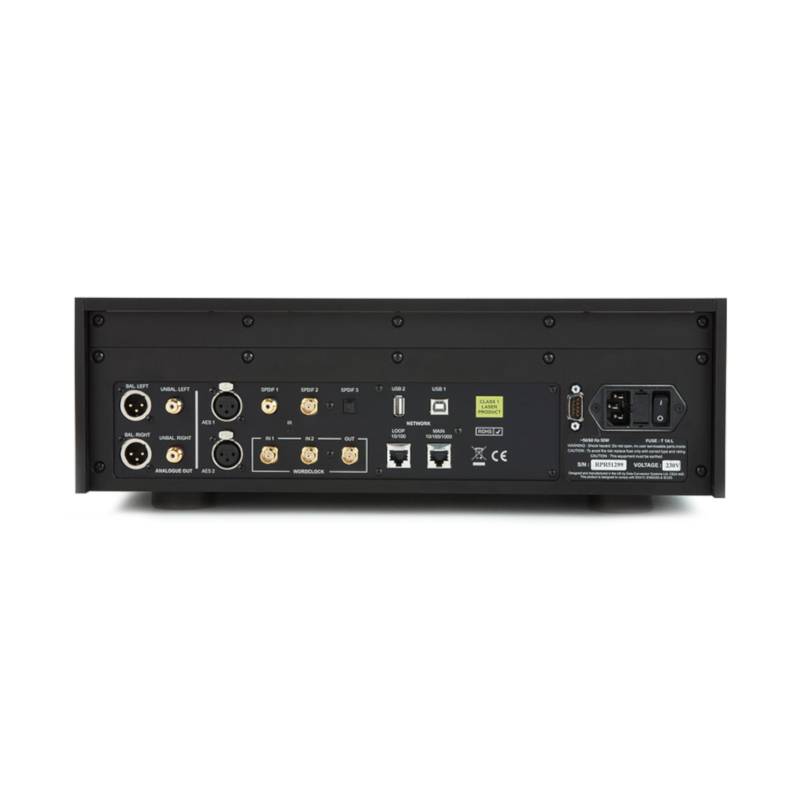 - Wejścia cyfrowe: Interfejs sieciowy na złączu RJ45 – Działa jak renderer UPnPTM w trybie asynchronicznym, przesyłając pliki cyfrowe z serwera NAS lub komputera osobistego, przy wykorzystaniu standardowej sieci Ethernet, dekodując wszystkie główne formaty bezstratne, włącznie z FLAC, WAV i AIFF w rozdzielczości natywnej do 24 bit 384kHz, plus DSD/64 i DSD/128 w formacie DFF/DSF. Pozostałe wspierane formaty, to WMA, ALAC, MP3, AAC i OGG. Niektóre formaty są ograniczone do niższych częstotliwości próbkowania. Akceptuje dane przesyłane z iPod’a, iPhone’a lub iPad’a, przez Apple AirPlay, 44.1 lub 48kHz.