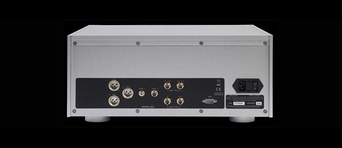 | Wyjścia cyfrowe | 1x interfejs Dual AES na 2x 3-pinowych męskich złaczach XLR, wysyła kodowany w standardzie dCS strumień danych DSD, bez wględu na to czy odtwarzana jest płyta CD czy SACD. Menu pozwala na zmianę formatu na DXD (24/352.8) podczas odtwarzania płyt CD. 1x AES/EBU na 3-pinowym męskim złączu XLR , wyjście danych formatu CD (16 bitów przy 44.1kS/s), bez wględu na to czy odtwarzana jest płyta CD czy SACD. 2x SPDIF na złączach 1x RCA Phono i 1x BNC. Każde wyjście transmituje dane CD, bez wględu na to czy odtwarzana jest płyta CD czy SACD. 1x optyczne SPDIF na złączu Toslink, transmituje dane CD, bez wględu na to czy odtwarzana jest płyta CD czy SACD. 1x interfejs SDIF-2 na złączach 2x BNC, transmituje dane CD, bez wględu na to czy odtwarzana jest płyta CD czy SACD. |